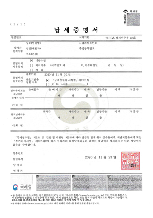 인쇄 버튼 누르시면 아래와 같이 납세증명서가 출력 됩니다.