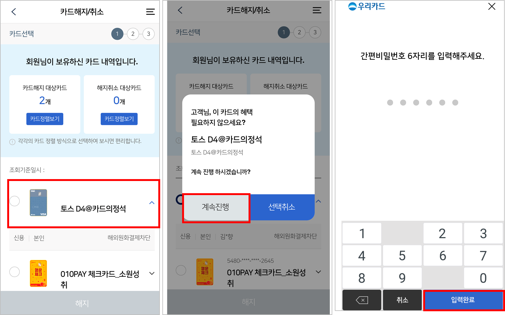 -해지할 카드 선택 후 비밀번호 입력해주세요.