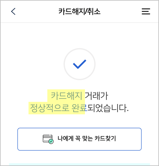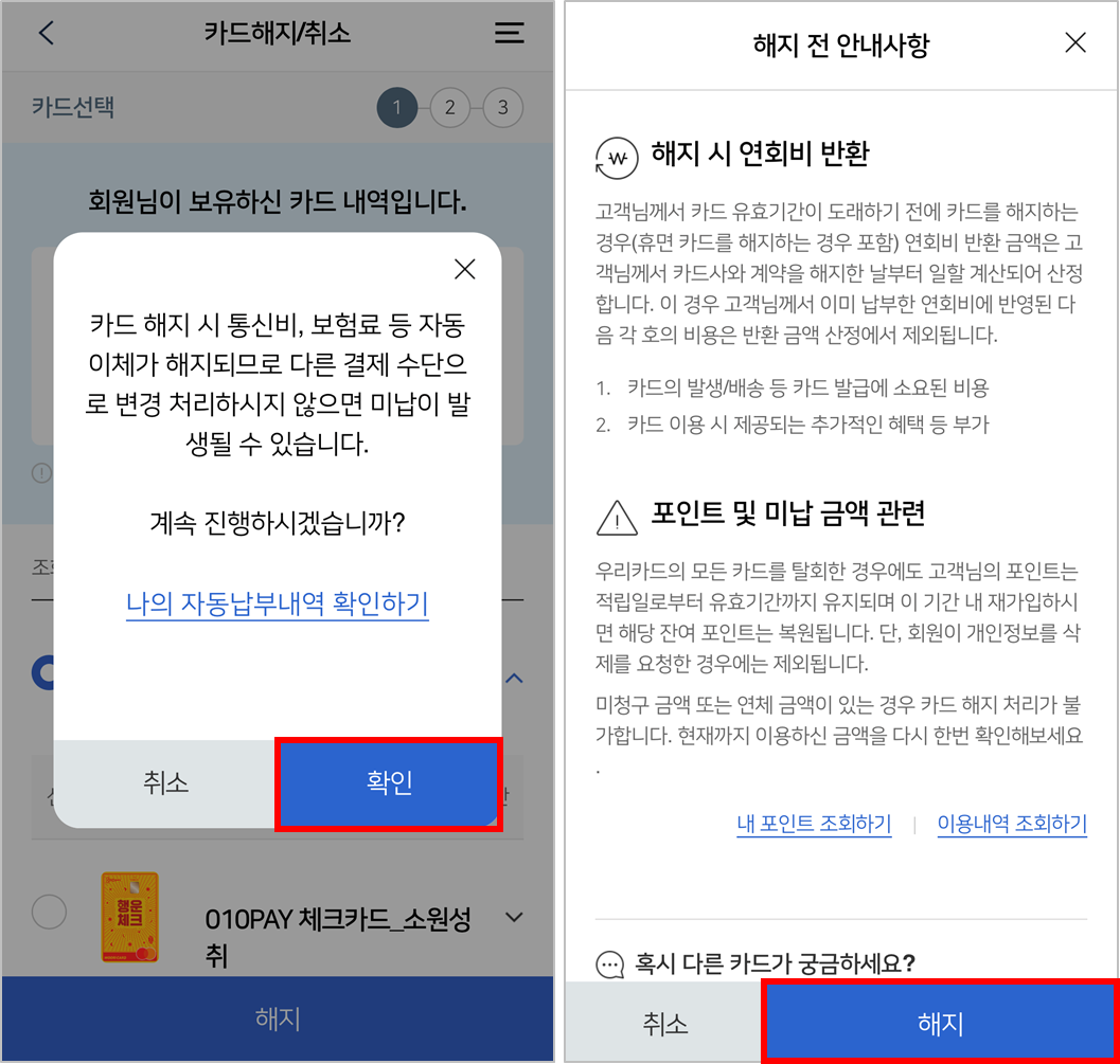 - 해지할 카드에 자동이체가 있는지 확인해주고 연회비 반환 안내사항도 확인해주세요.
