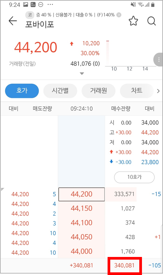 장 개장 2분 전, 1분 전 매수 주문서는 빠지지 않고 계속 쌓여 결국 앞자리 4까지 도달!!!
