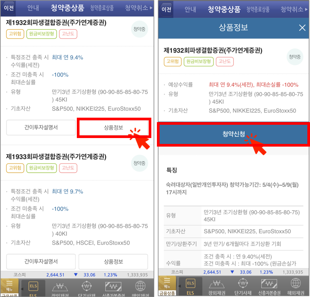 ELS는 원금 100% 비보장 상품으로 청약 후 투자숙려기간을 가집니다.