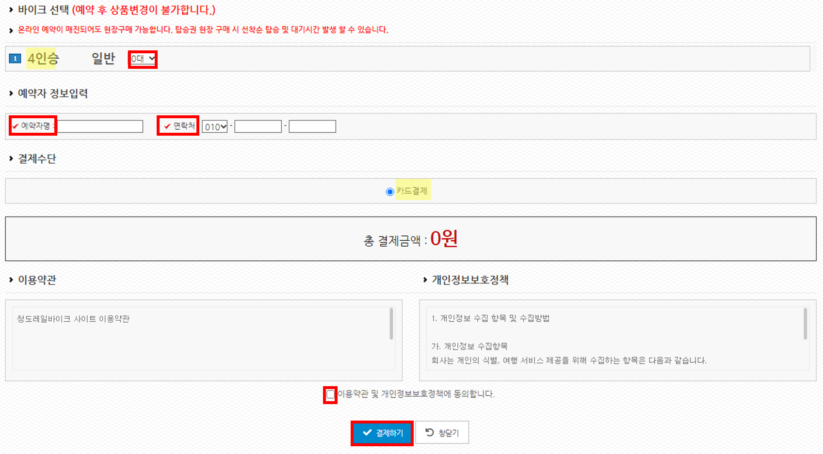 4. 바이크 대수 및 개인 정보 입력 후 결제하기