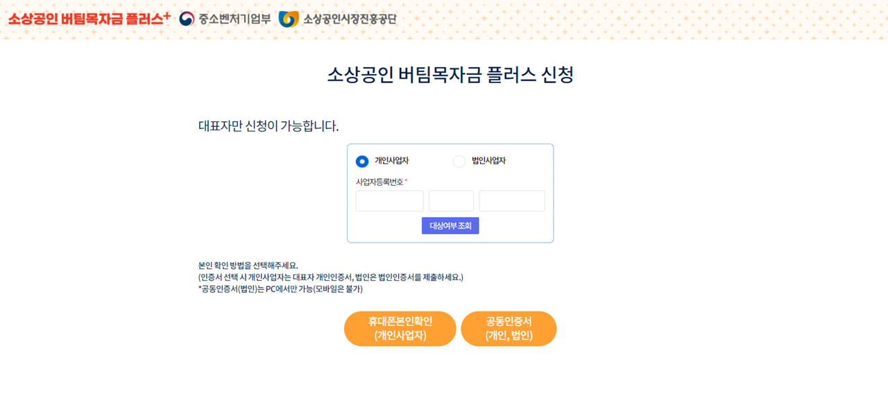 개인사업자 : 휴대폰(본인 확인) or 공동 인증서