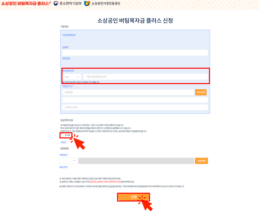 신청 결과 안내받을 휴대전화 번호 입력과 입금계좌 정보 동의 후 신청 버튼 눌러주면 됩니다.