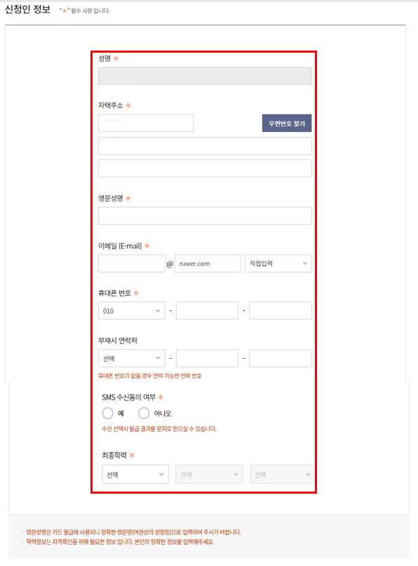 영문성명, 최종학력 입력, SMS 수신동의 여부 체크해주세요.