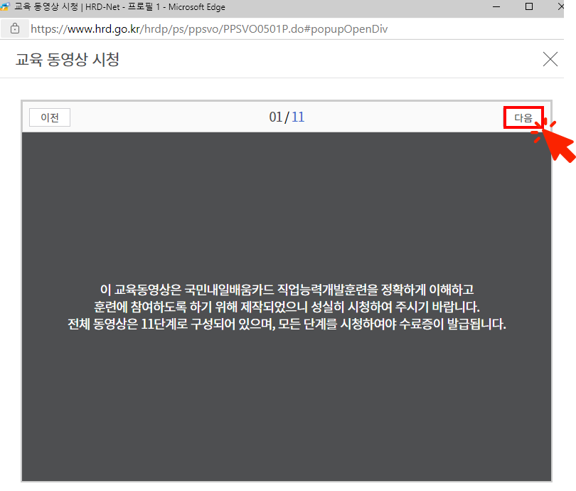 보통 약 2~3분 정도 동영상이고 각 동영상이 끝나면 다음 버튼 눌러서 11개 모두 시청하면 됩니다.