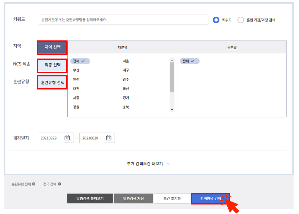 본인이 희망하는 지역과 직종, 훈련유형에 맞게 선택 후 검색 눌러주시면 됩니다.