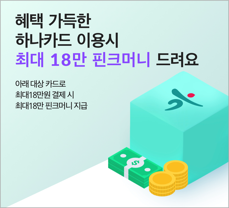 오늘은 '핀크' 앱 통해 하나카드 발급하고 18만원 캐시백 받는 방법 알려드리도록 할게요.