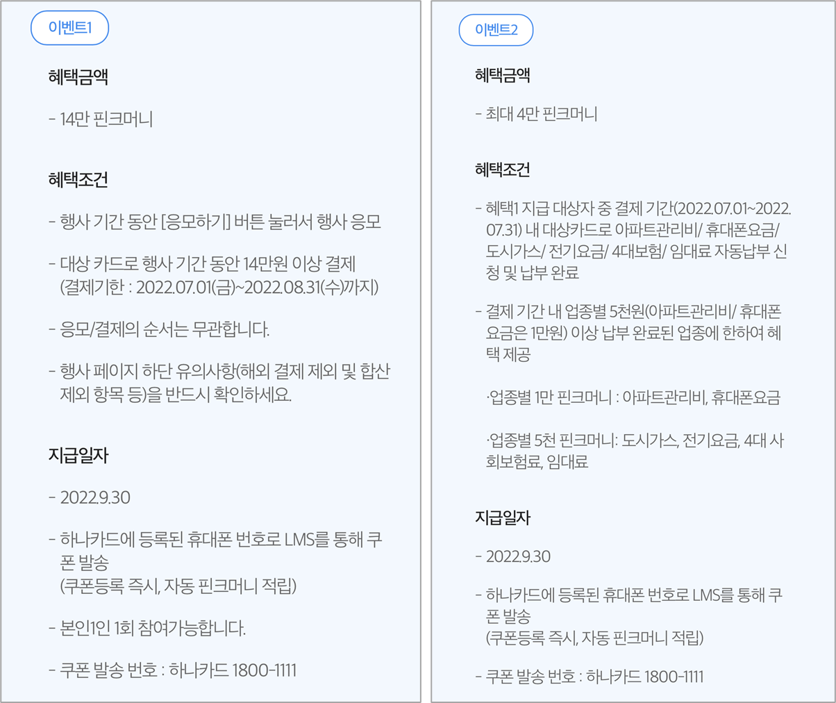 하나카드 발급 이벤트는 이벤트 1_14만원 / 이벤트2_4만원 총 18만원 캐시백으로 나눠져요.