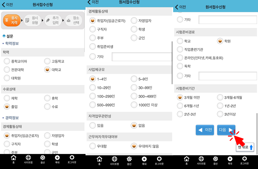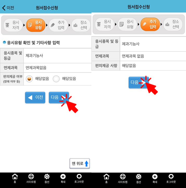 8. 응시 유형, 추가입력 확인 후 다음 누르기