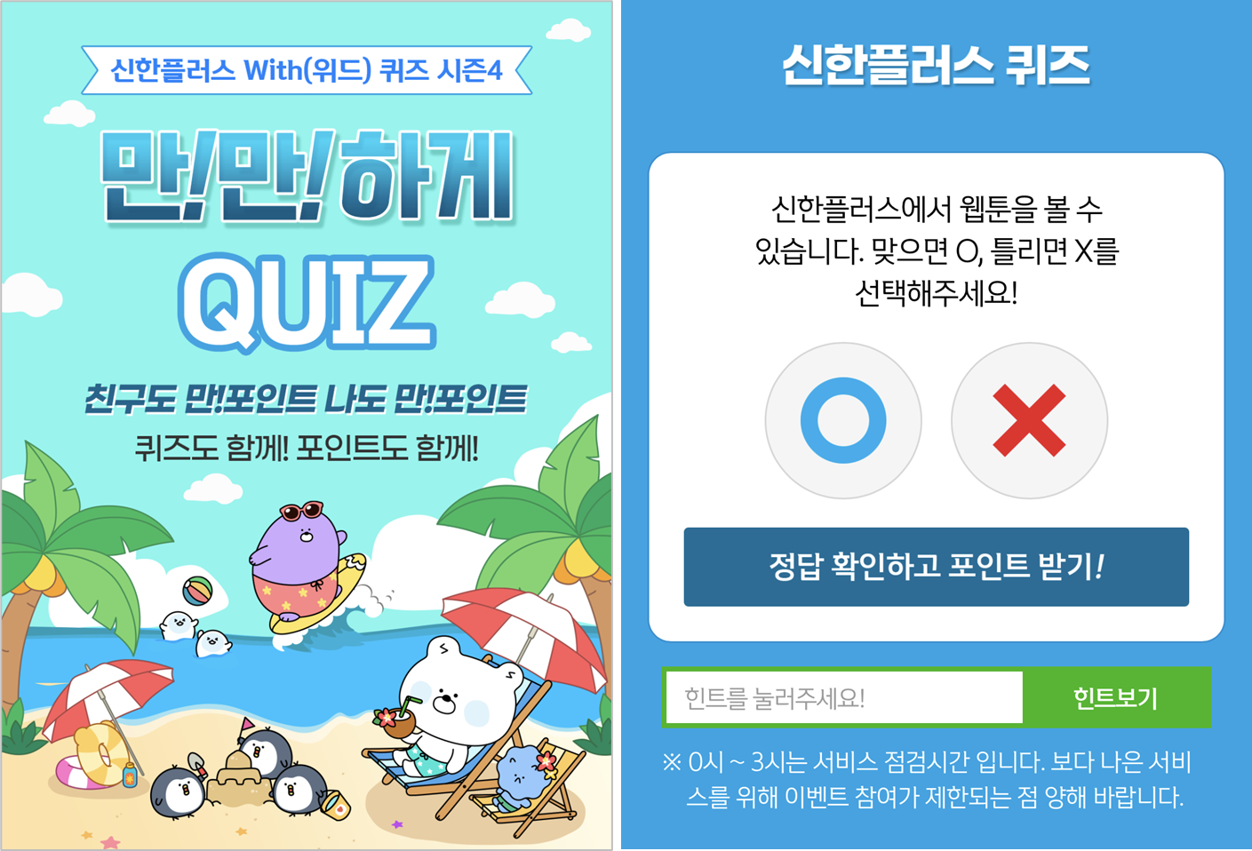 Q: 신한플러스에서 웹툰을 볼 수 있습니다. 맞으면 O, 틀리면 X를 선택해주세요!