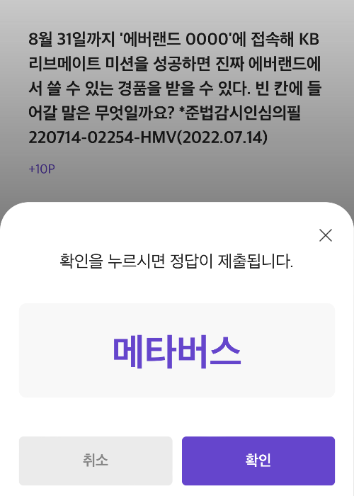 Q: 8월 31일까지 '에버랜드 0000'에 접속해 KB리브메이트 미션을 성공하면 진짜 에버랜드에서 쓸 수 있는 경품을 받을 수 있다. 빈칸에 들어갈 말은 무엇일까요?