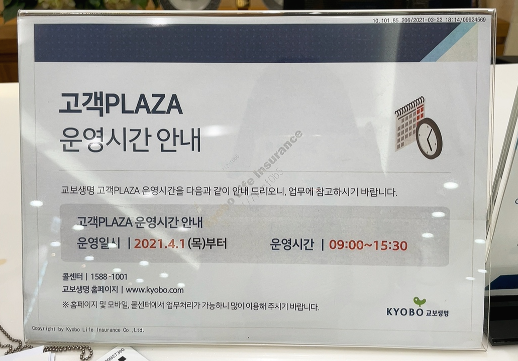 교보생명 고객프라자 운영시간은 9시 ~15시 30분까지 입니다.
