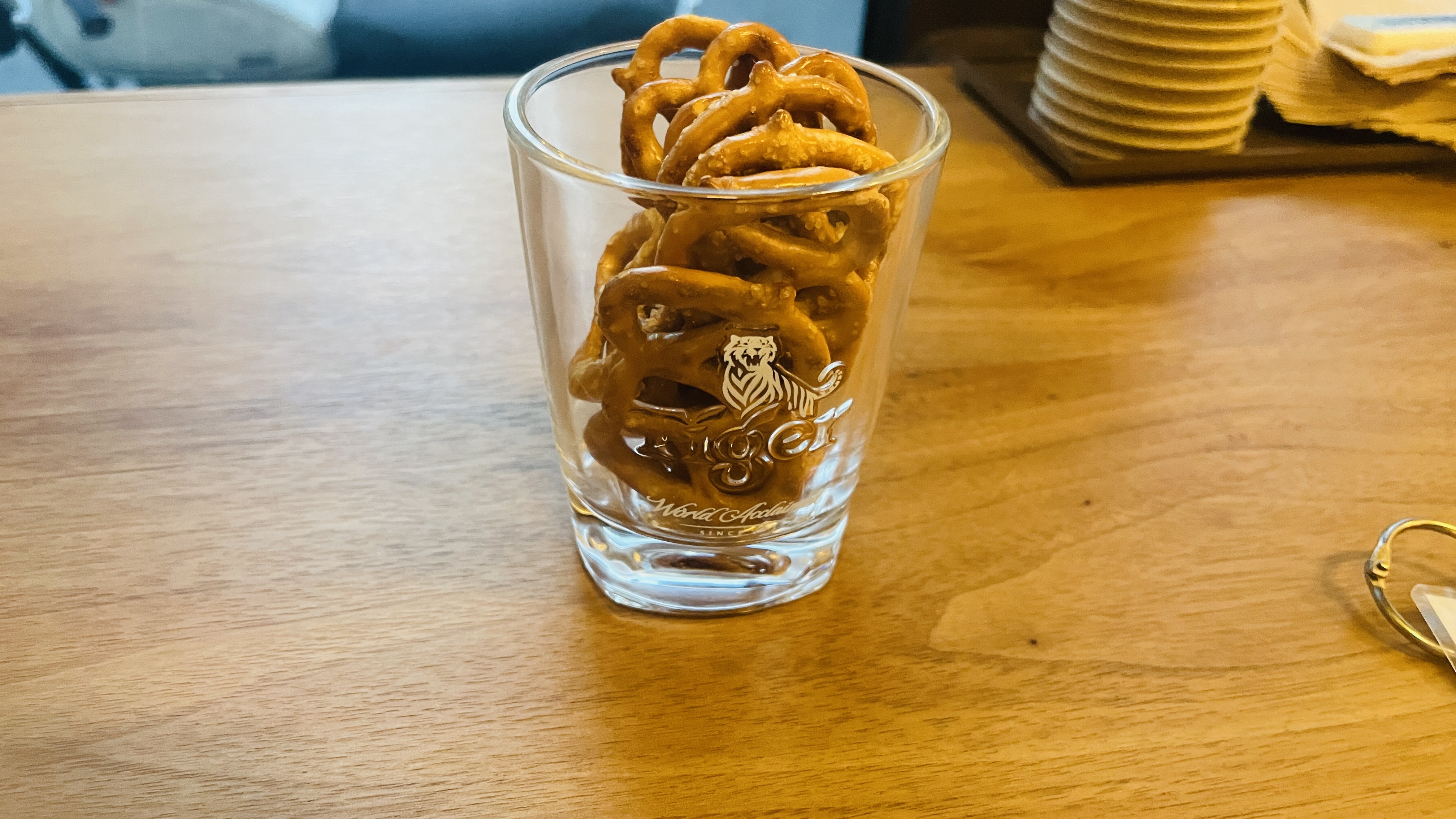 기본안주로는 귀여운 잔에 프레즐이 나와요.
