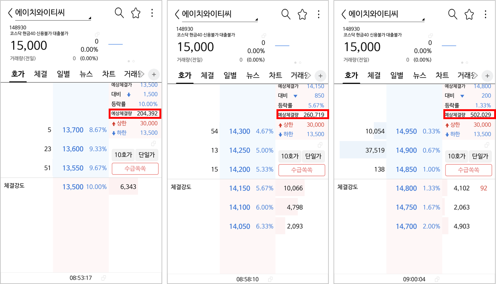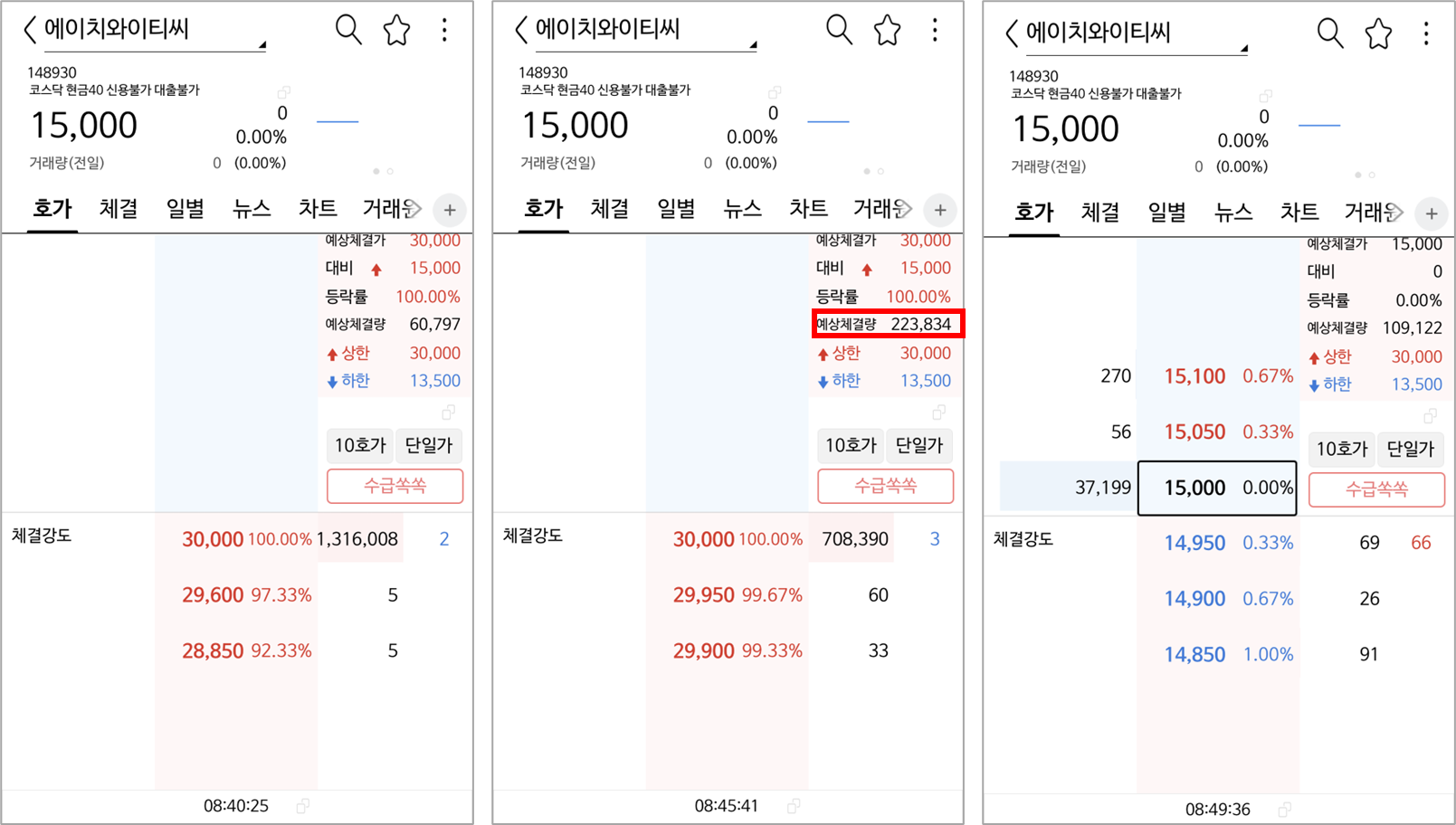 하지만 8시 45분 예상 체결량을 모시면 20만건이 넘는 체결량이 있습니다.
