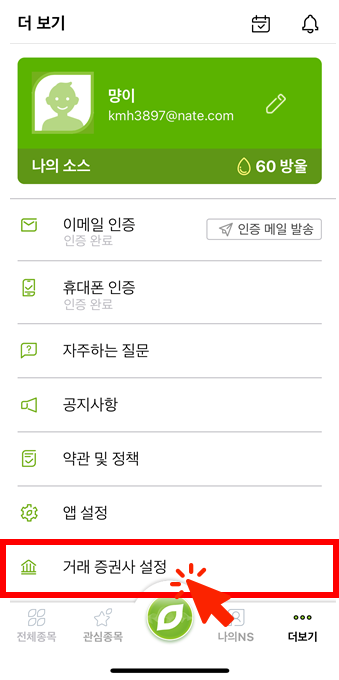 같은 페이지 하단의 거래 증권사 설정 눌러주세요.