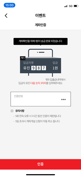 입력한 본인 계좌 확인을 위해 입금자 번호 3자리 확인 후 입력해줍니다.