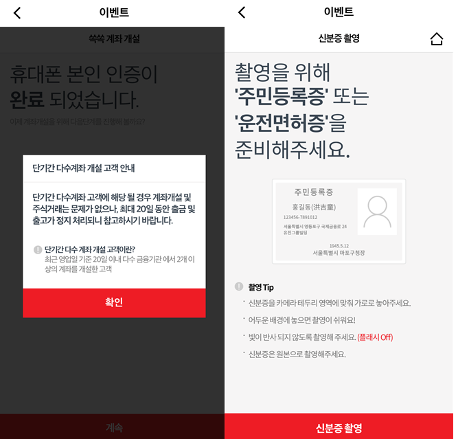 신분증 촬영은 '주민등록증' 또는 '운전면허증' 가능합니다.