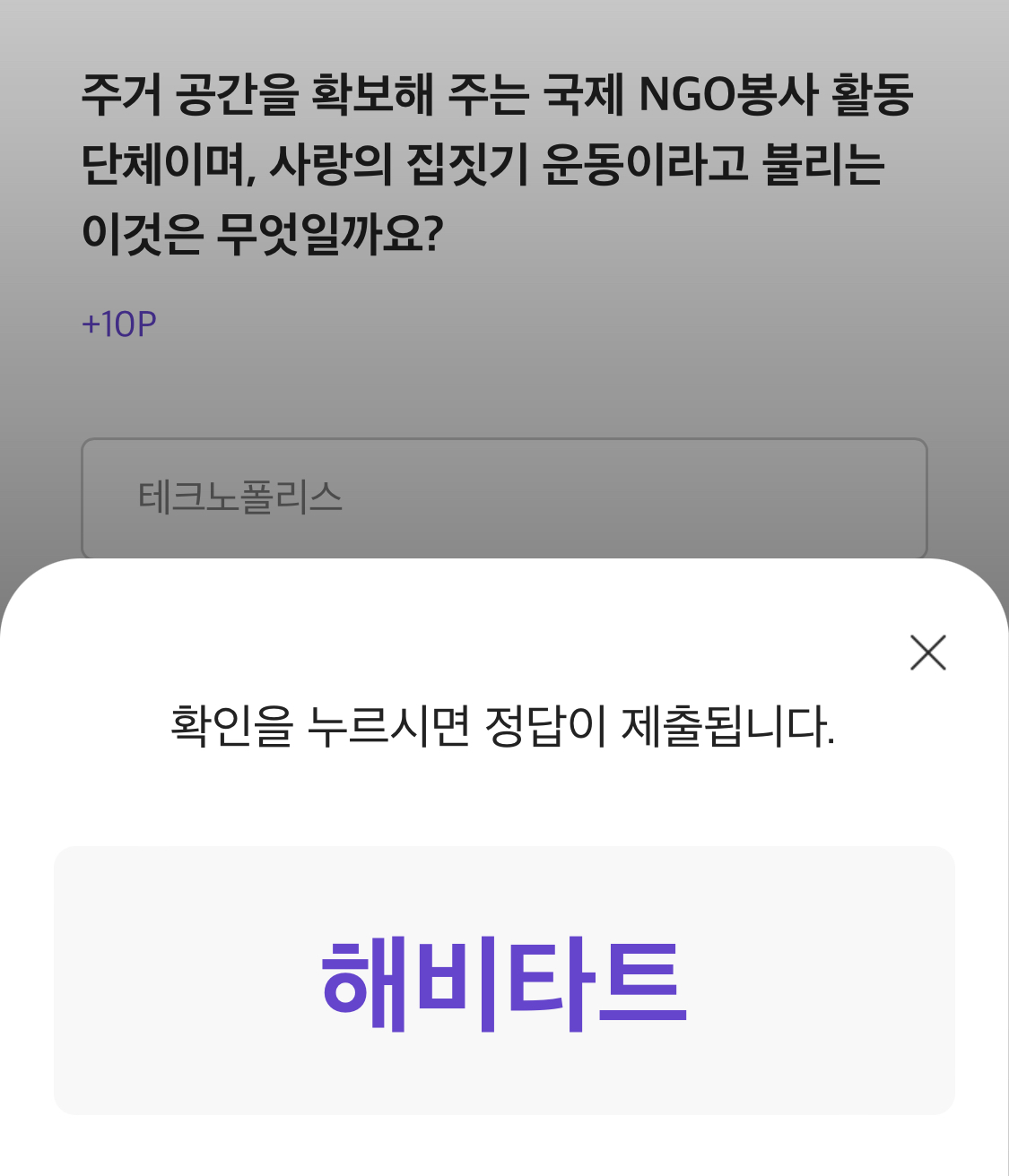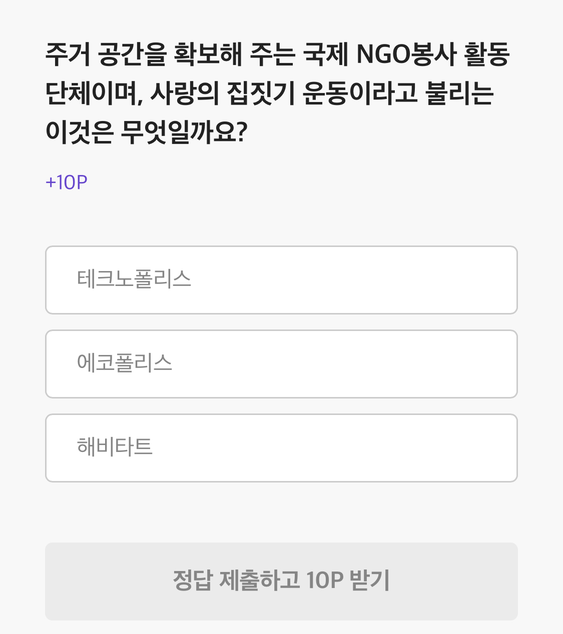 Q: 주거 공간을 확보해 주는 국제 NGO봉사 활동 단체이며, 사랑의 집짓기 운동이라고 불리는 이것은 무엇일까요?