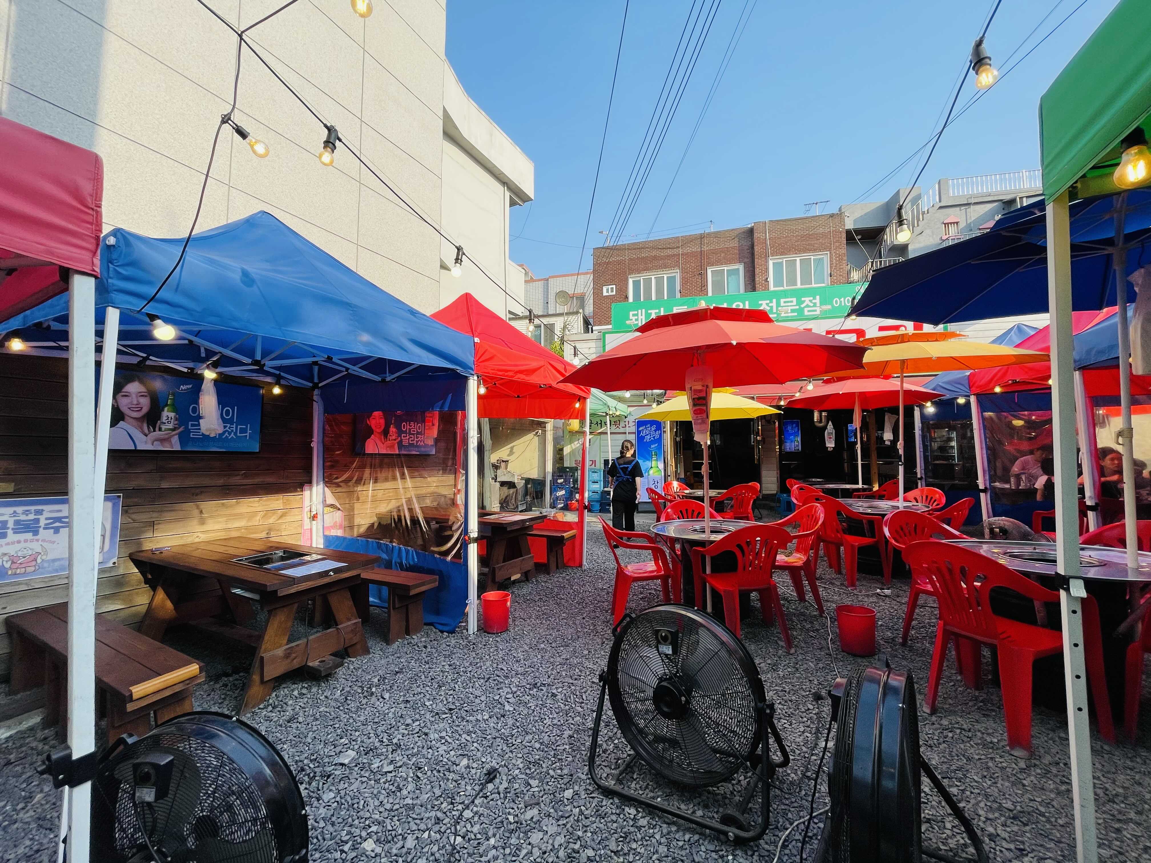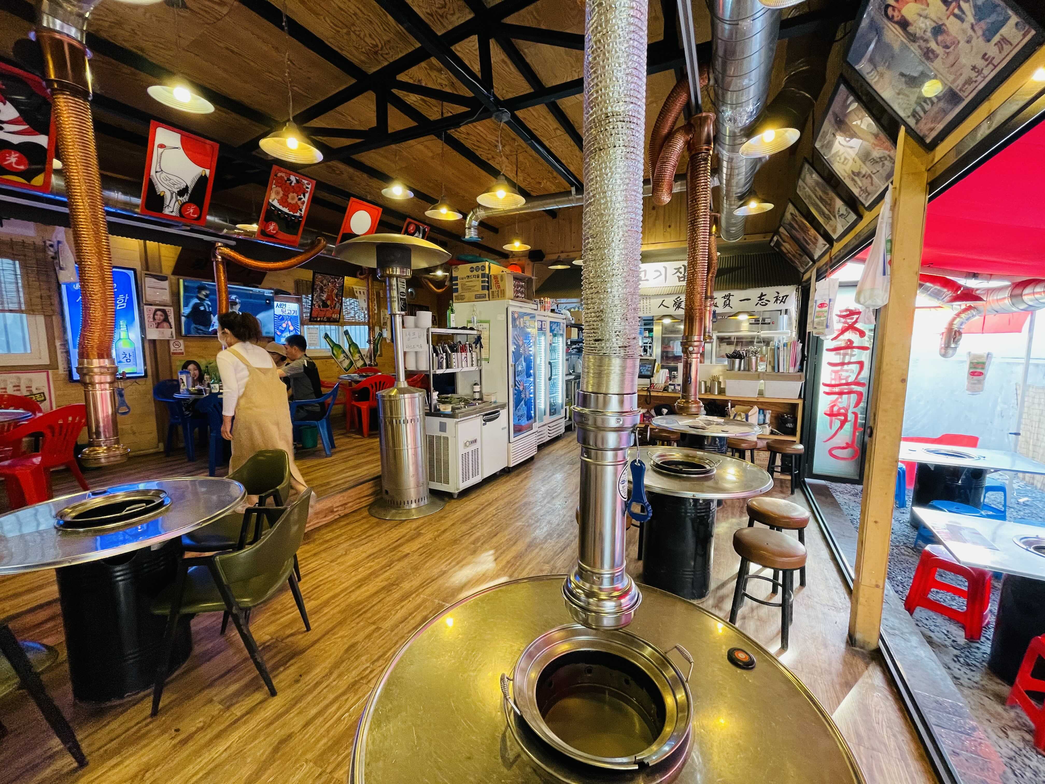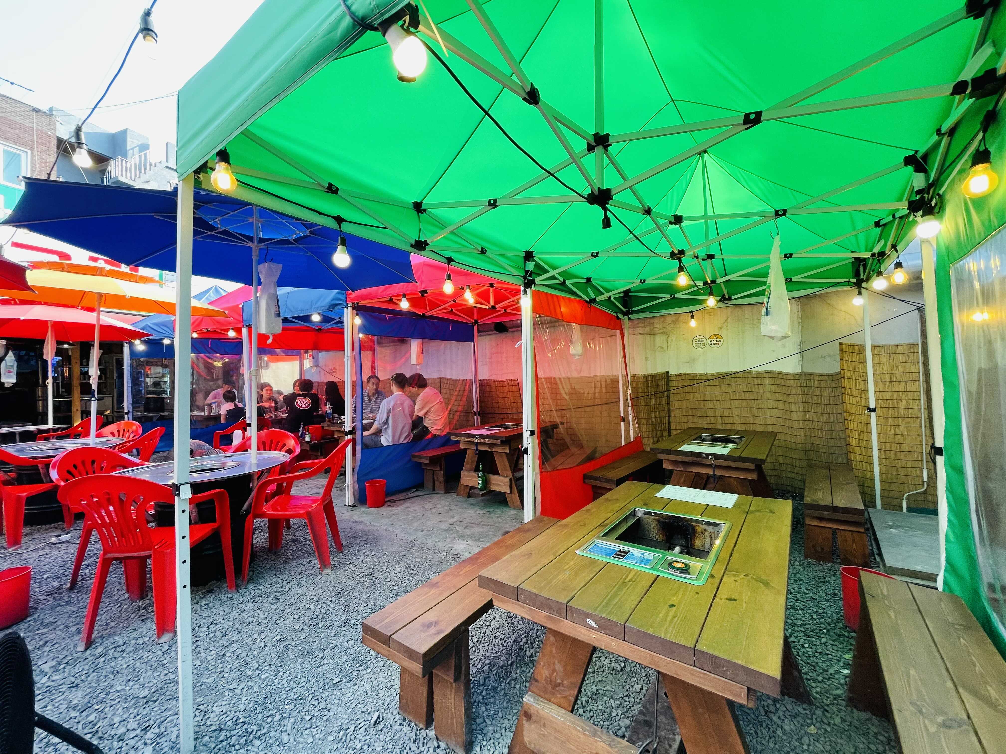 ‘서민옛날뒷고기’는 입구부터 포장마차 인테리어로 눈길을 사로잡아요.