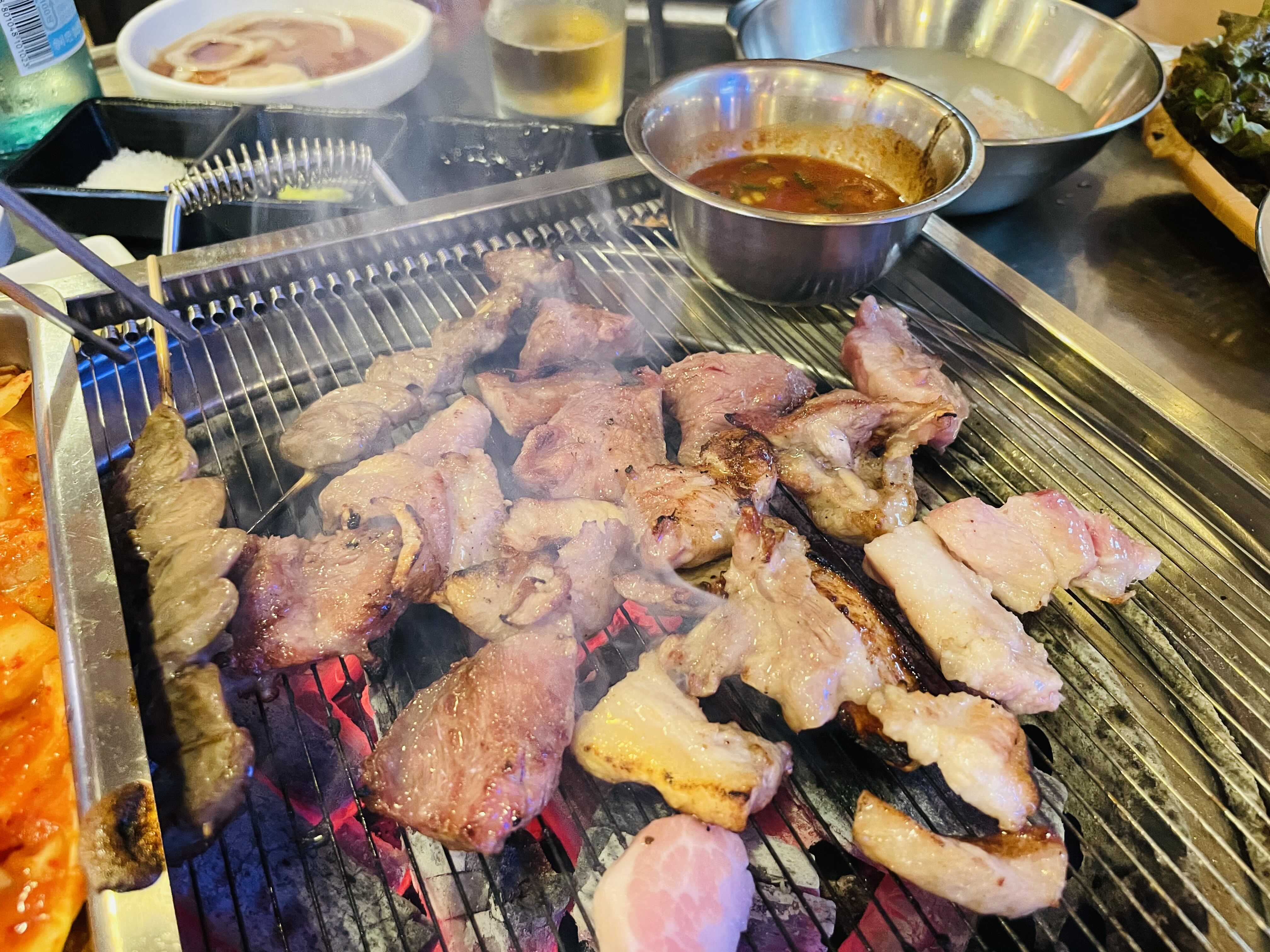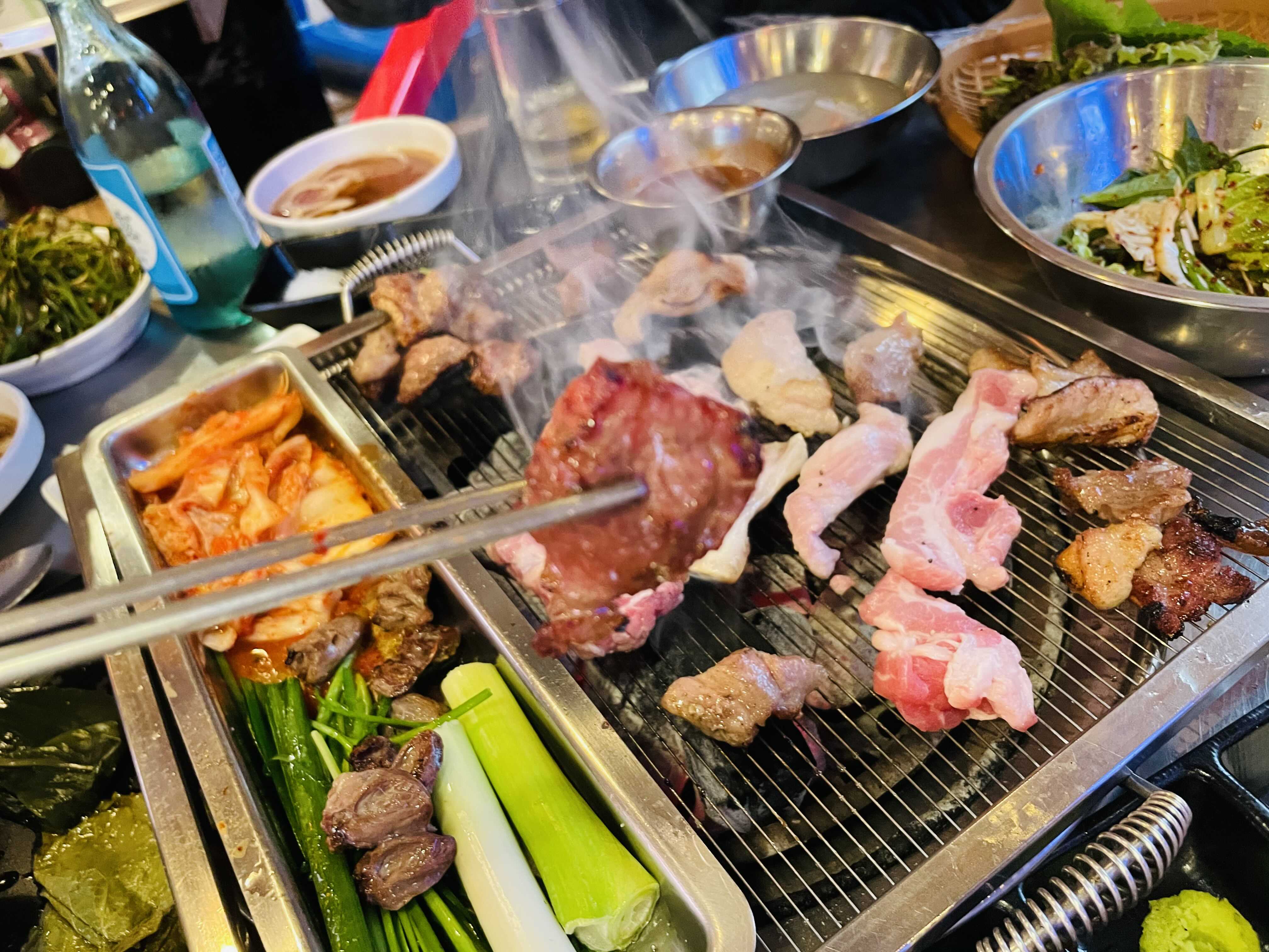 불판 위에 빼곡히 구워지는 고기들