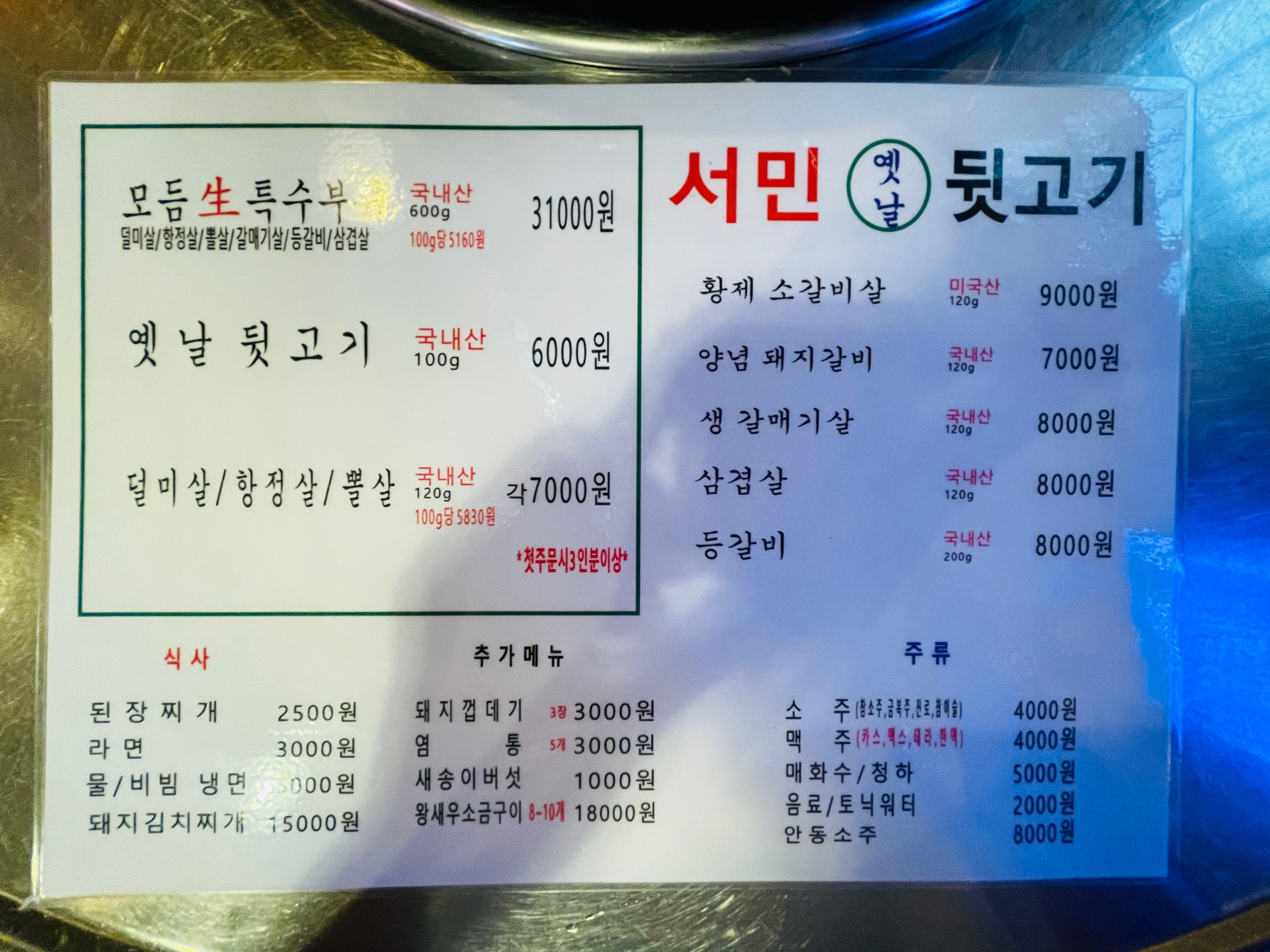 ‘서민옛날뒷고기’ 메뉴판이에요.