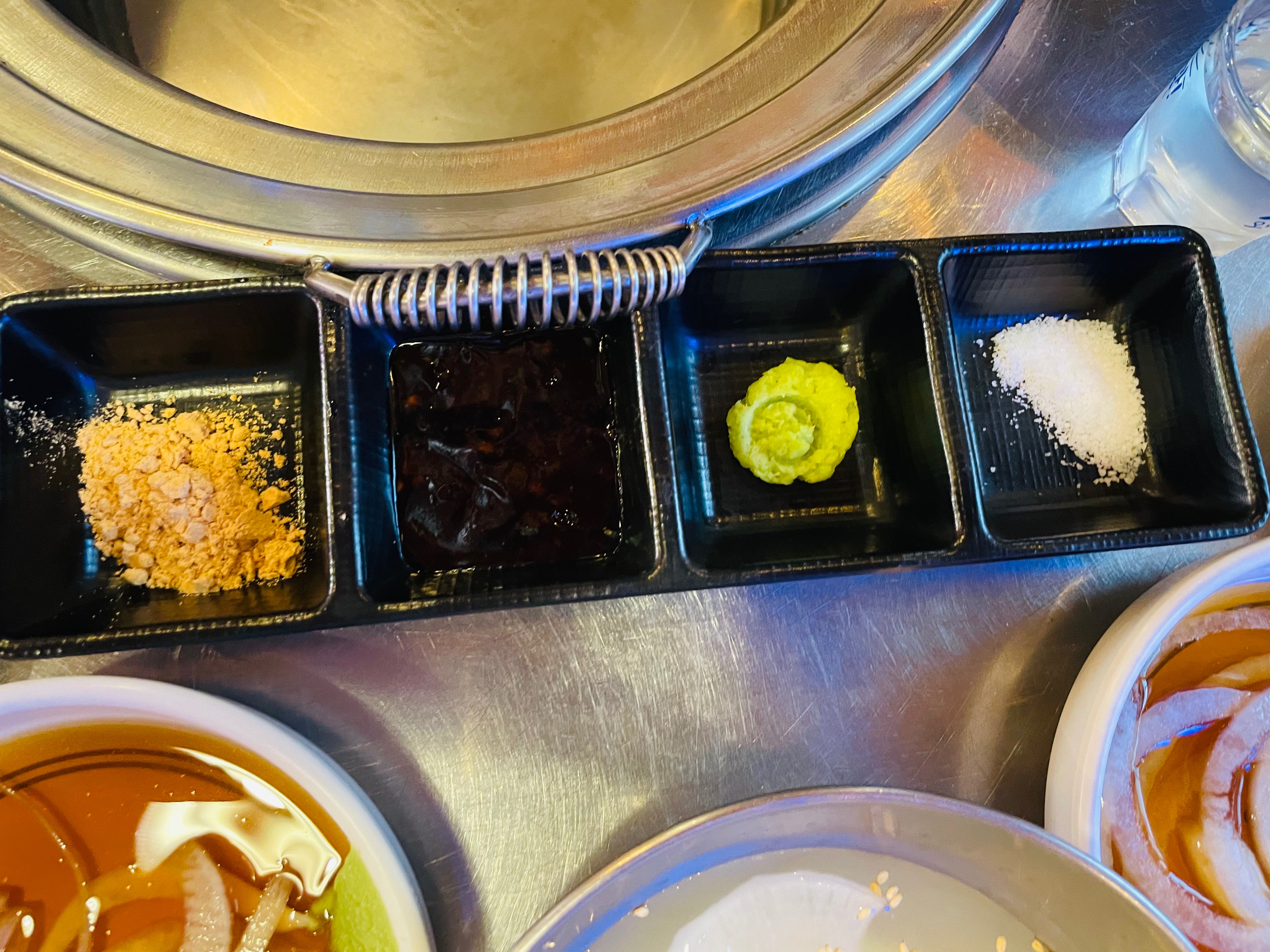 콩가루, 데리야끼소스, 와사비, 소금