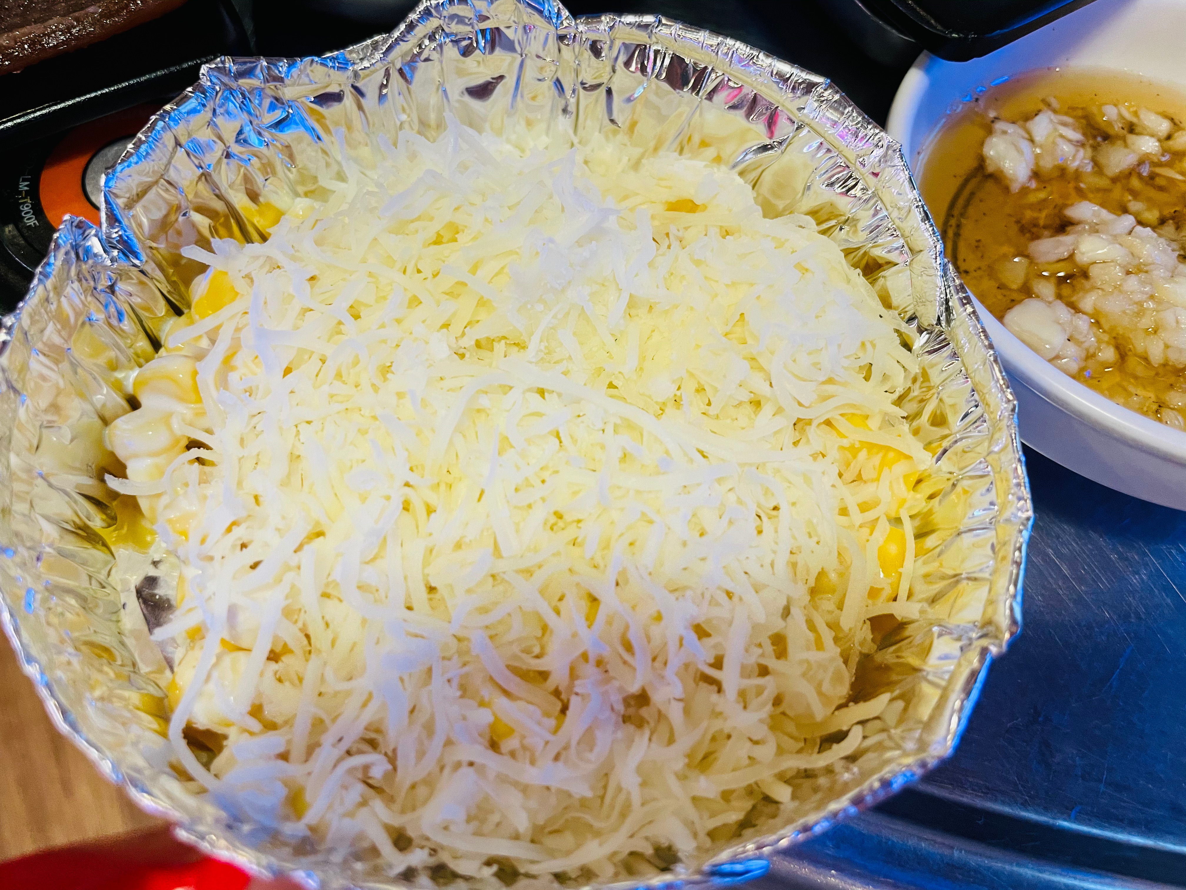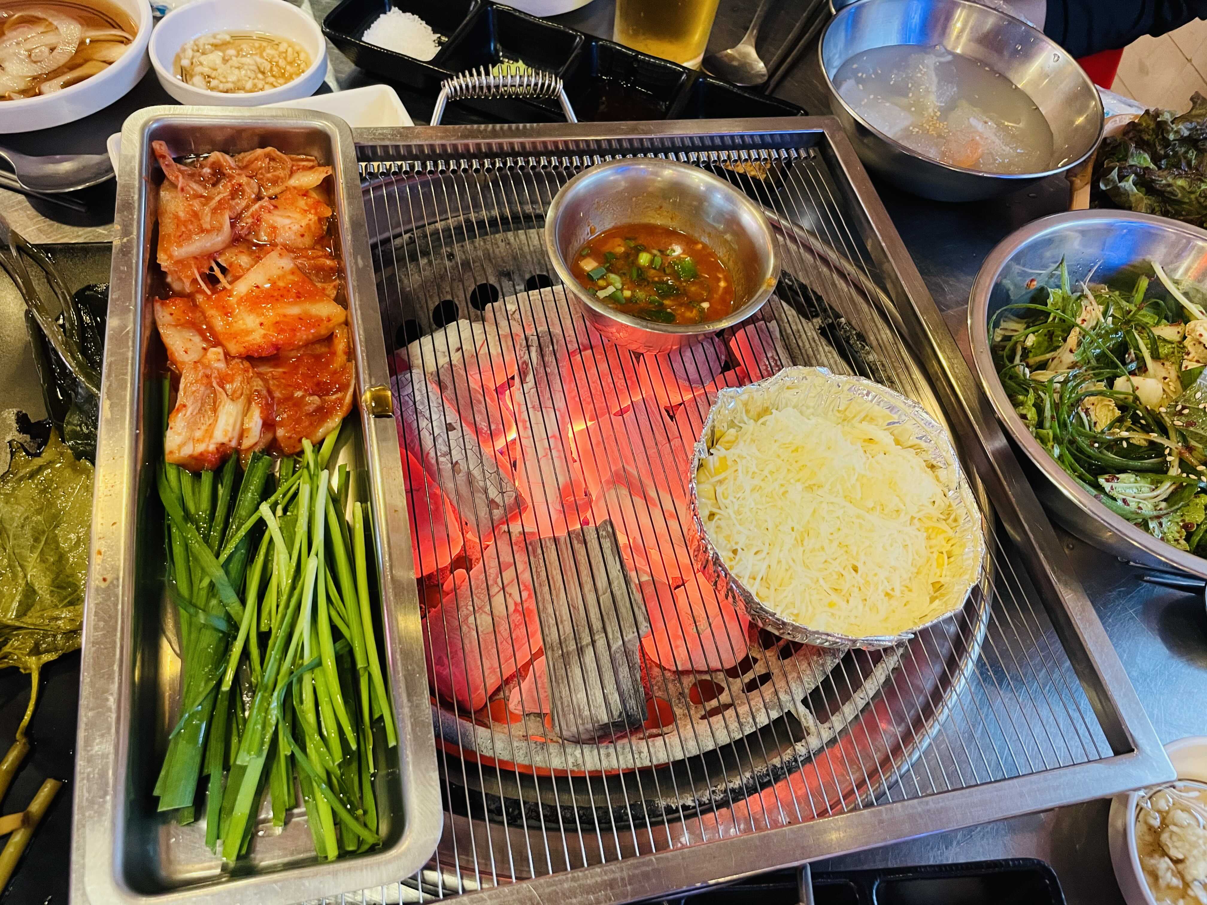 불판 위에 김치, 부추 올려주고 멜젓이랑 치즈콘도 올려줬어요.