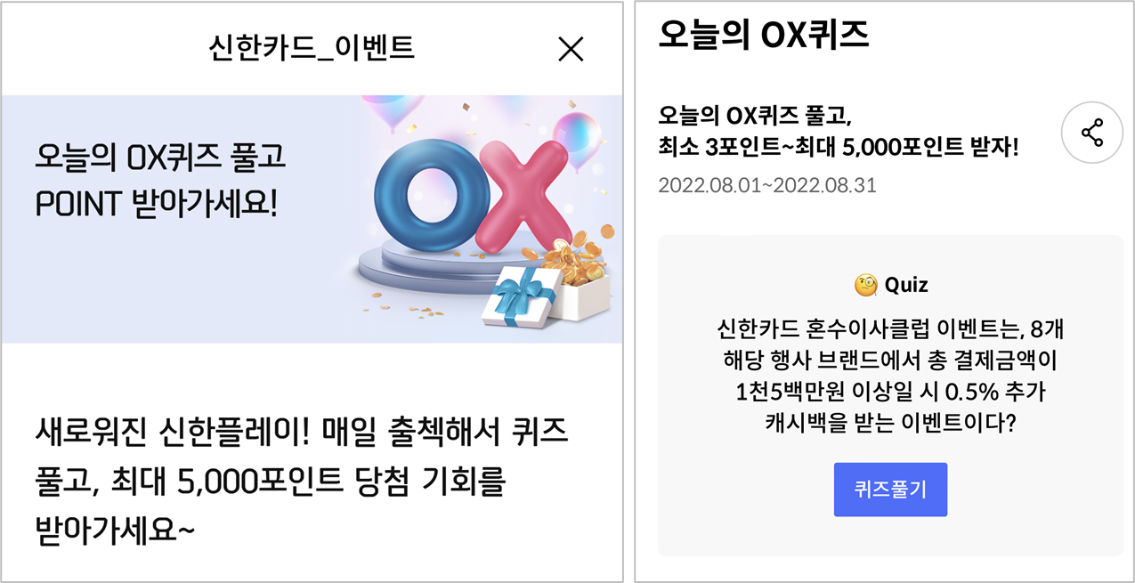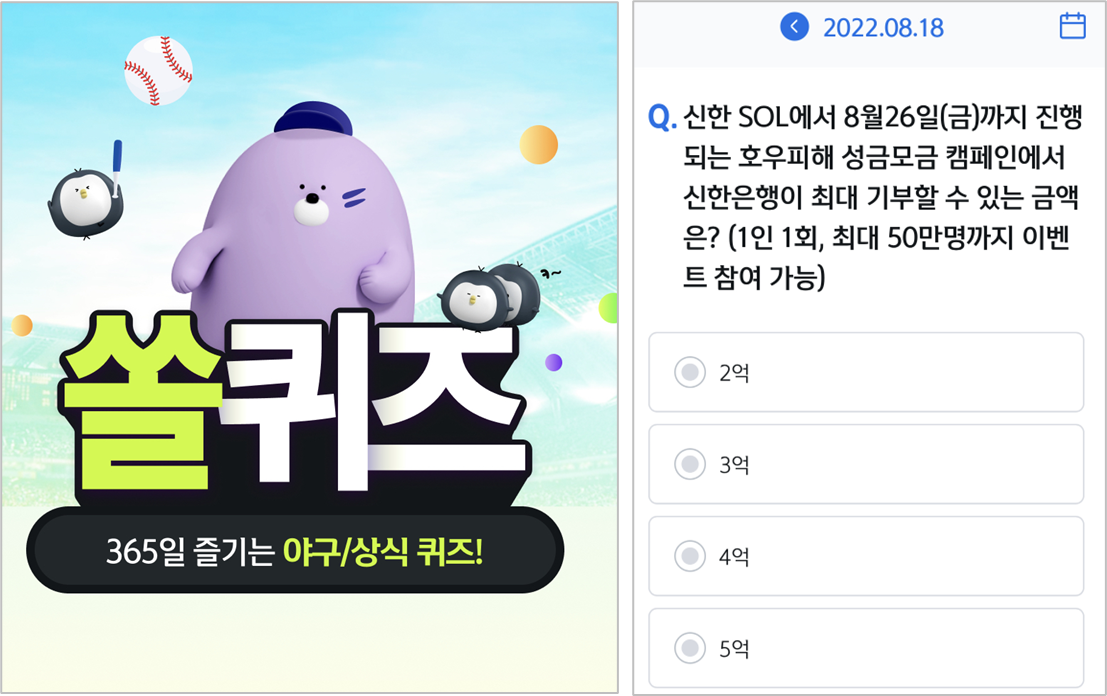 | 8월 17일 신한 플레이 OX 퀴즈 / 신한 쏠 야구상식 쏠퀴즈 정답 (0) | 2022.08.17 |