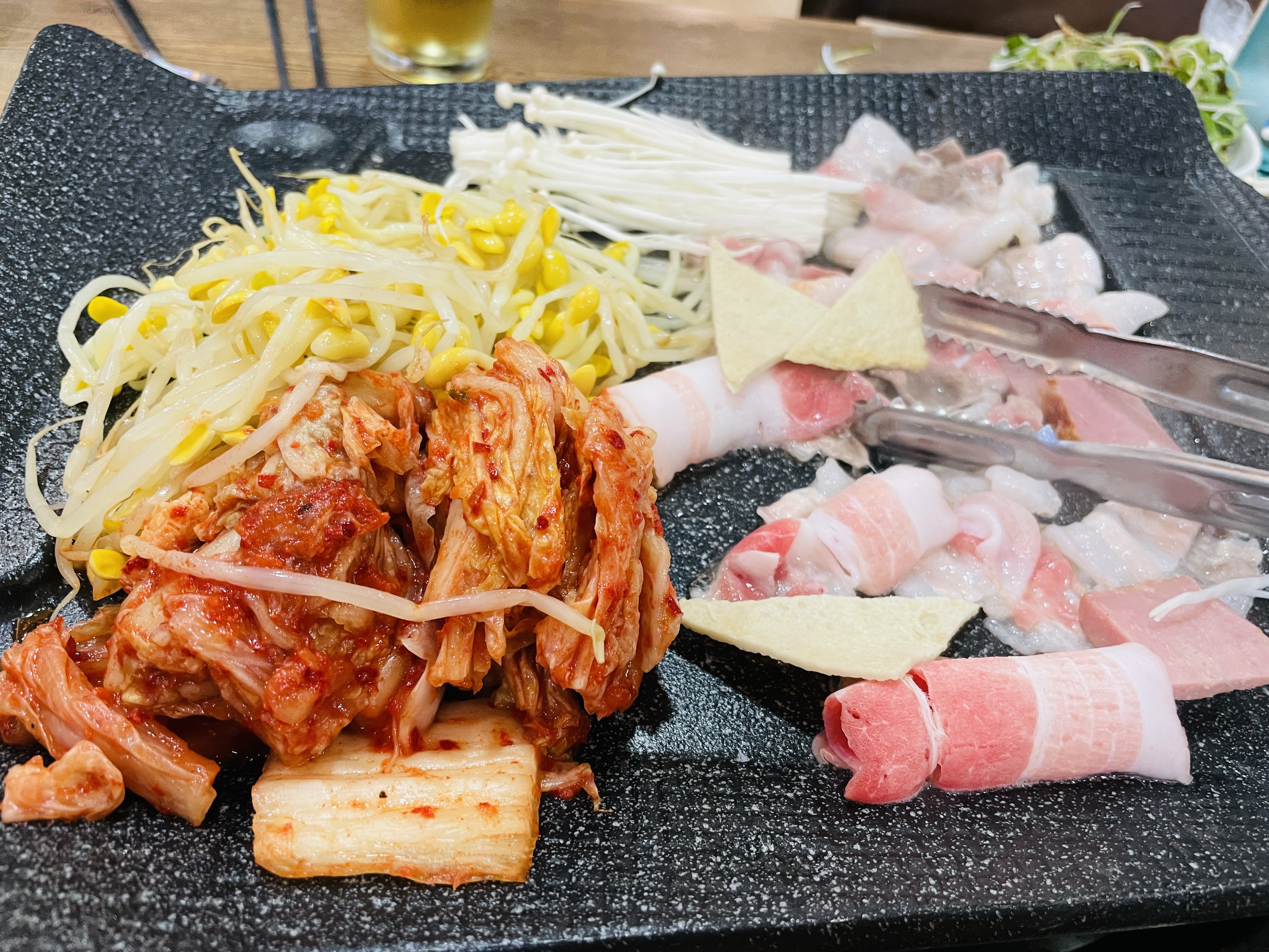 불판에 반은 김치, 콩나물 올려주고 반은 대패삼겹살 올려서 구워주는거 대박집 국룰인거 알고 계지쥬???
