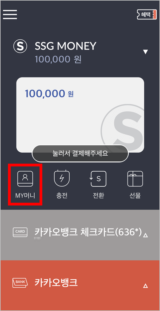 - SSG PAY 어플 로그인 후 MY 머니 눌러주세요.