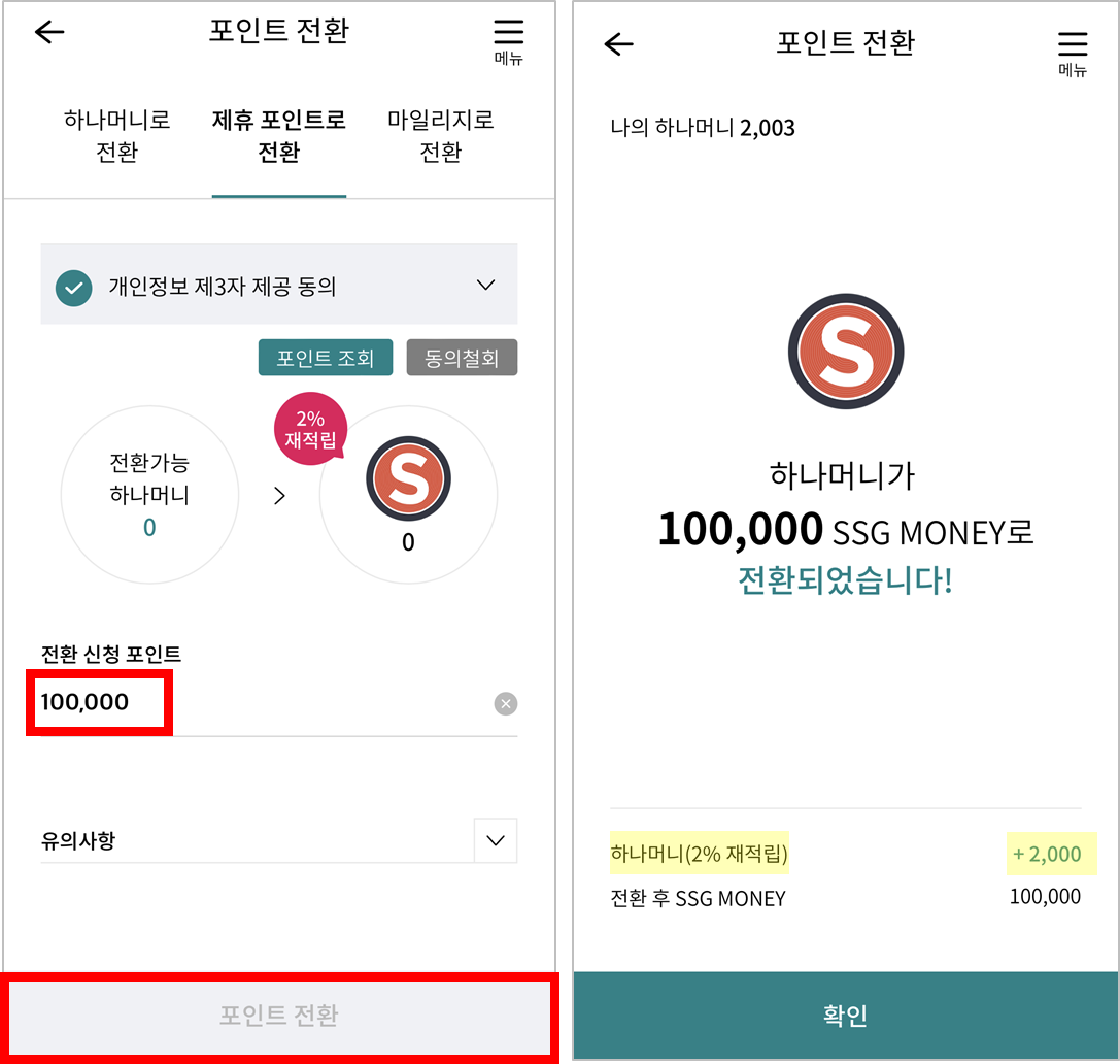 하나머니에서 쓱머니(ssg money)로 전환하면 2% 재적립을 해줘요.