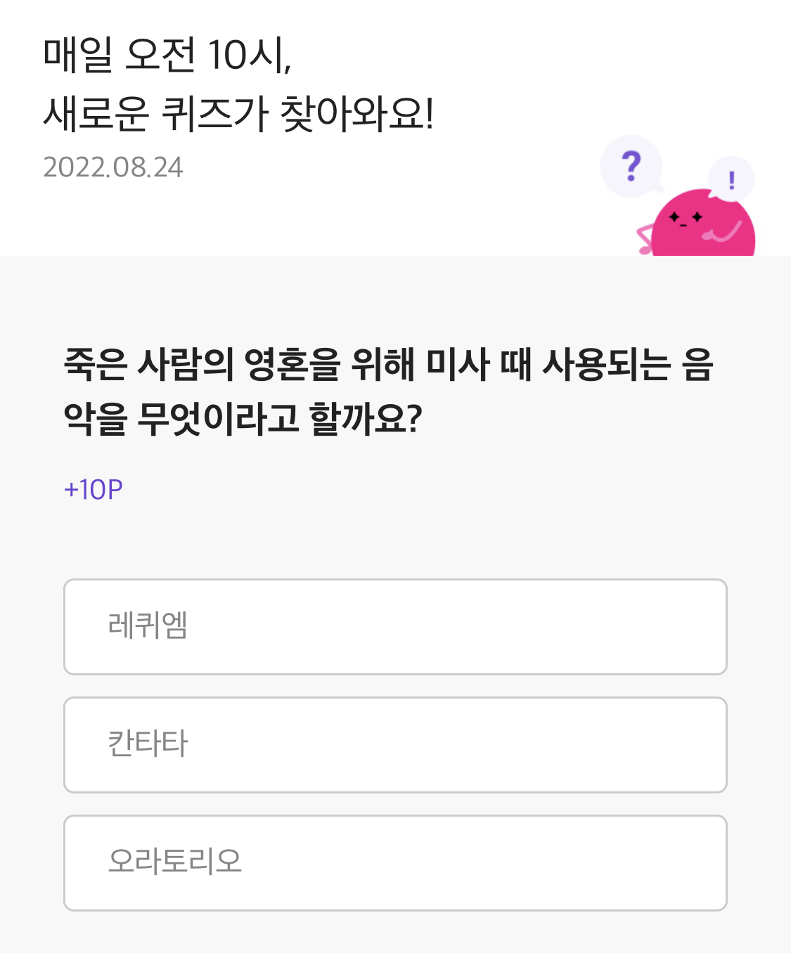 | 8월 25일 리브메이트 오늘의 퀴즈 정답 (0) | 2022.08.25 |