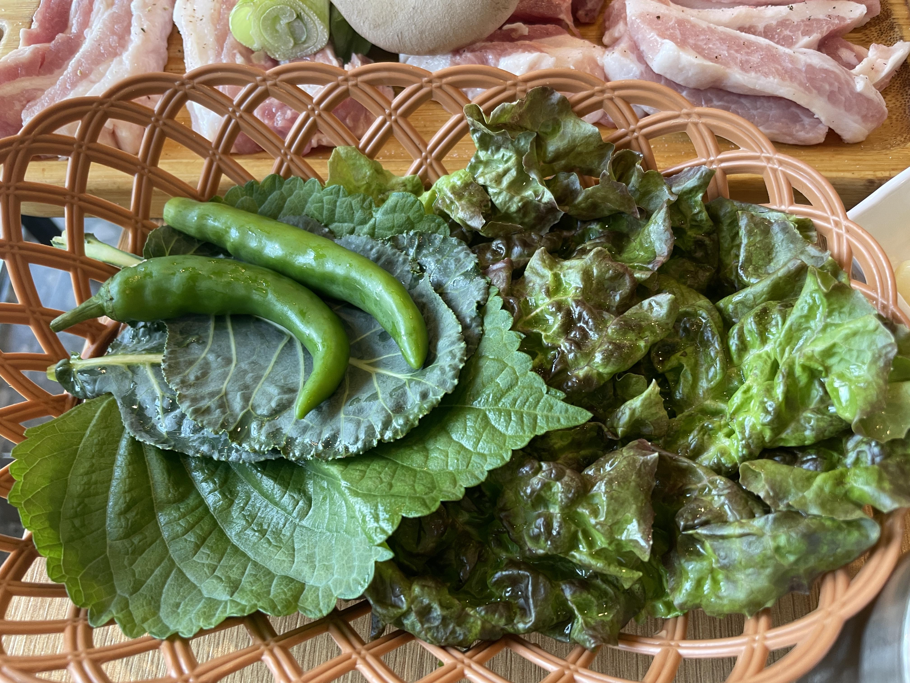 쌈야채도 상추, 깻잎에 흔치 않은 케일까지 나와더라구요 ㅎㅎ