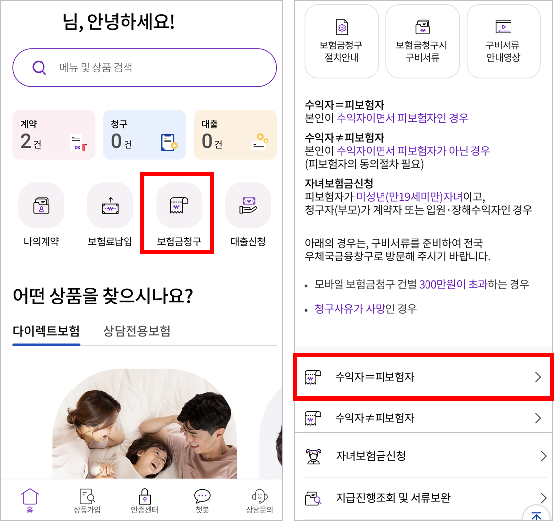 -청구안내사항 확인해 해당하는 수익자&피보험자 형태 눌러주세요.