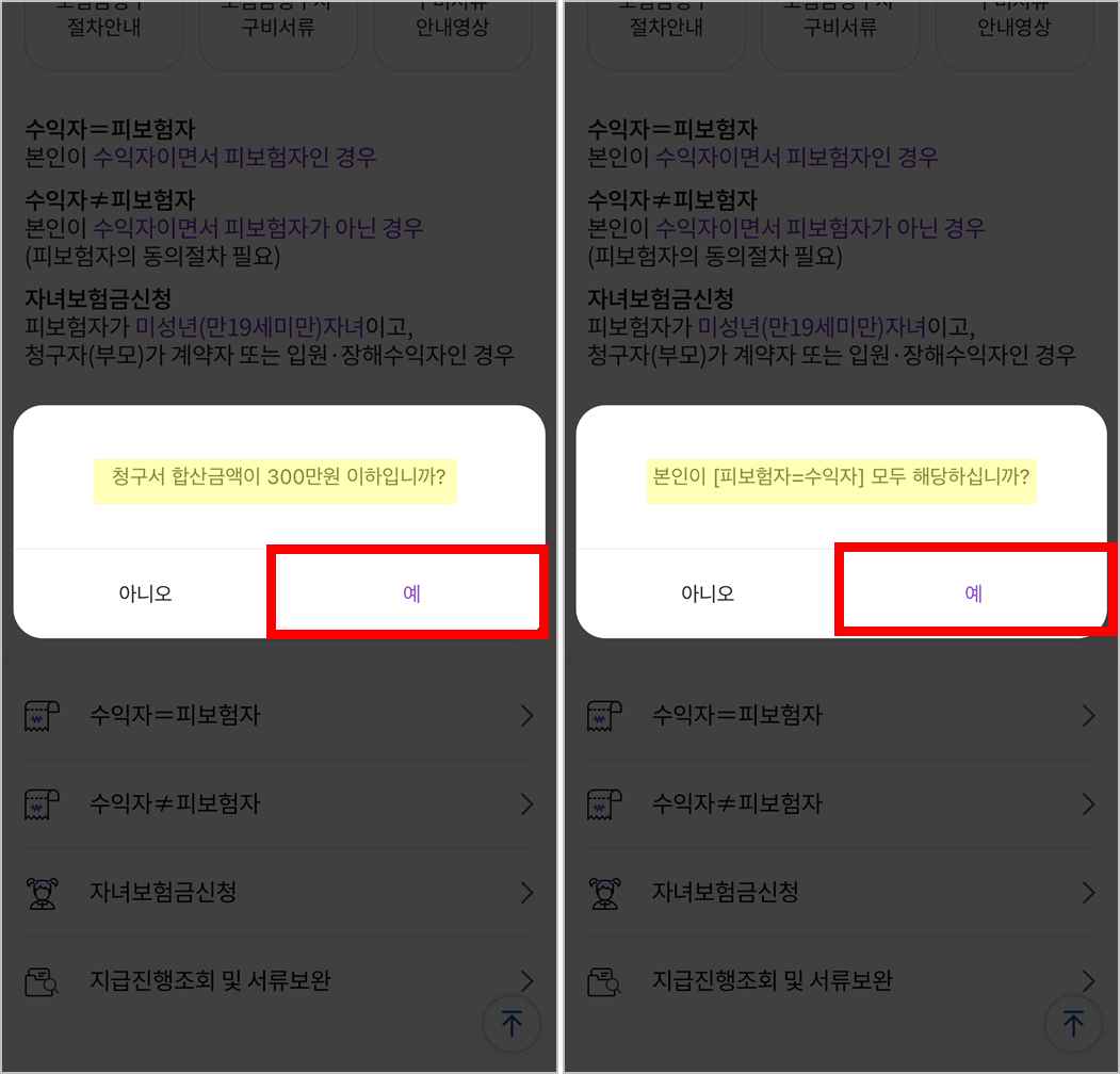 - 청구서 합산금액 300만원 이하, 피보험자=수익자 확인 후 '예' 눌러주세요.