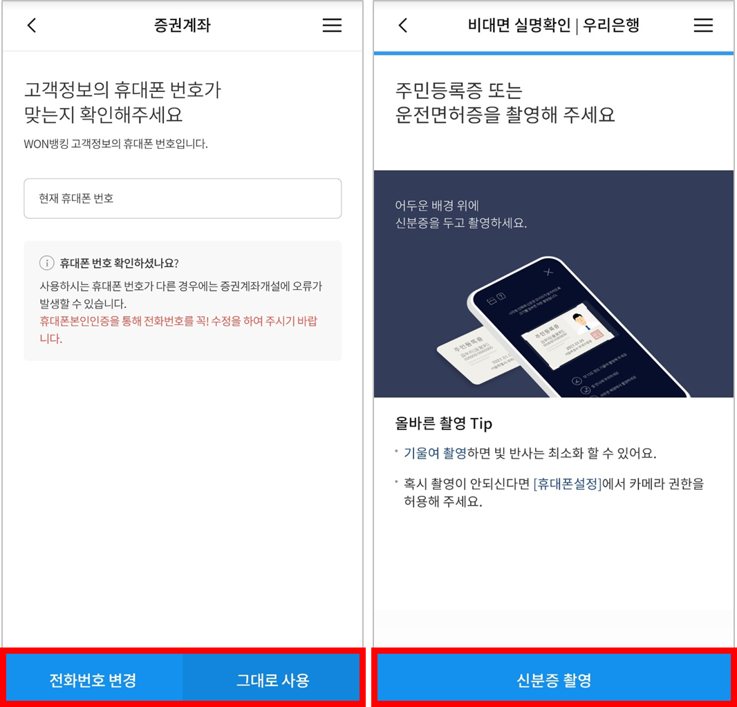 - 고객정보 확인을 위해 '본인 휴대폰 번호' 확인 및 '신분증' 촬영해주세요.