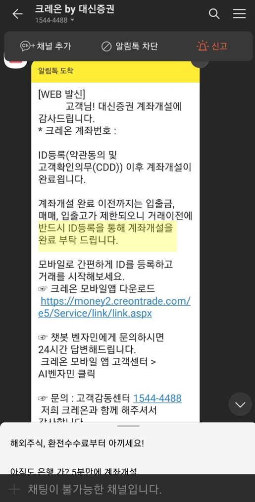 -우리은행 통해 계좌개설이 완료되면 카톡으로 개설된 대신증권 계좌번호가 발송됩니다.