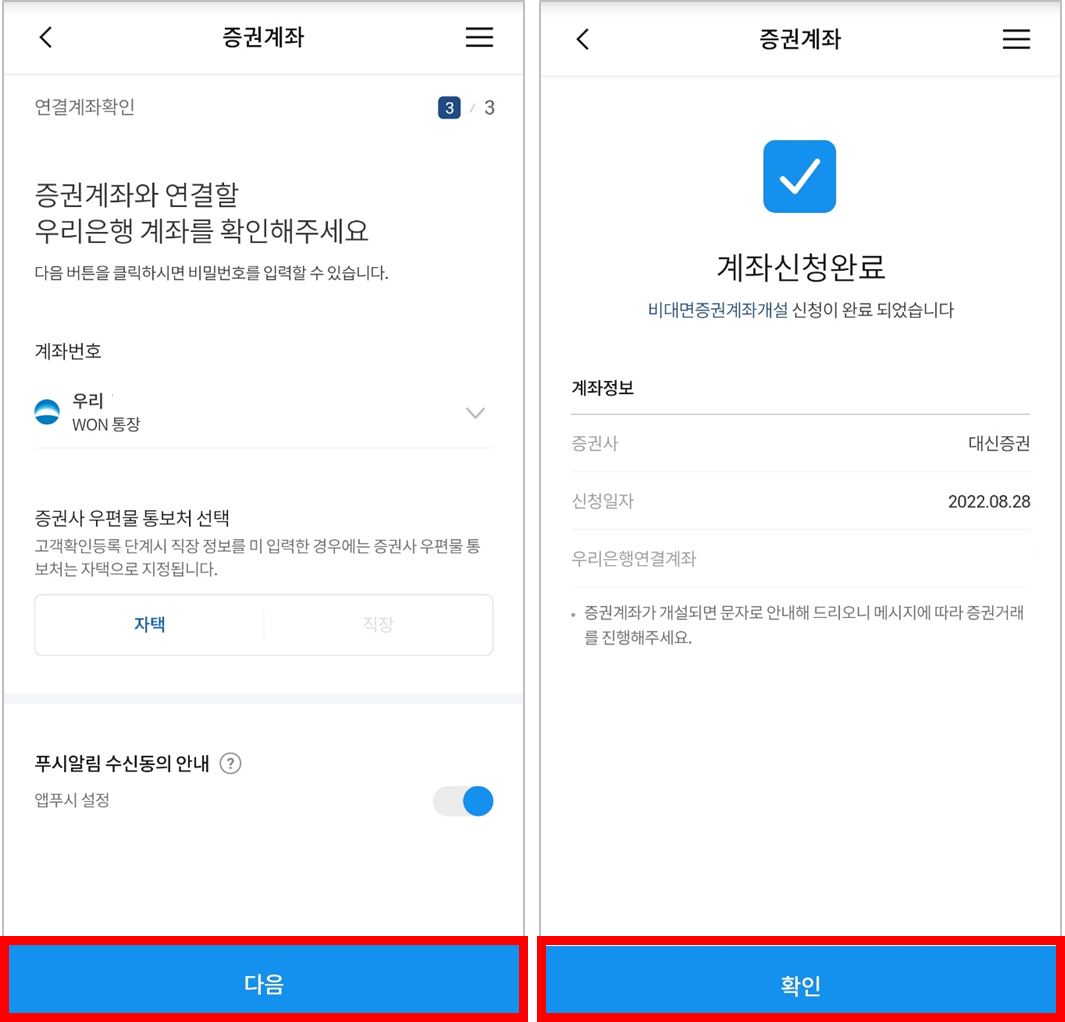 -대신증권 계좌와 연결될 우리은행 확인까지 하면 계좌신청이 완료됩니다.