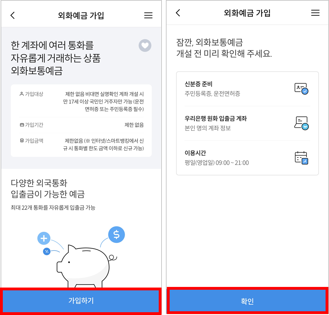 -외화예금 가입 동의, 고객확인등록(연락처, 주소 등)해주세요.