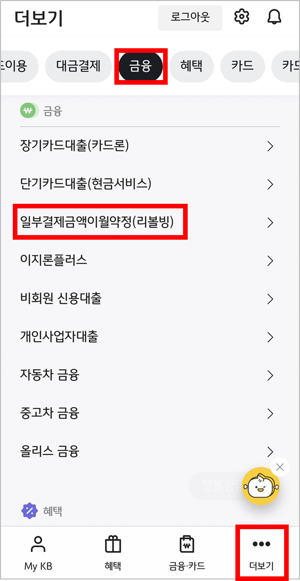 -더보기 페이지에서 '금융' 누른 후 3번째 메뉴 '일부결제금액이월약정(리볼빙)' 눌러주세요.