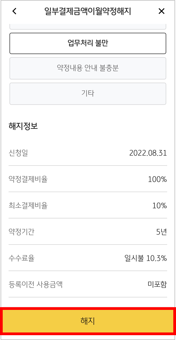 -해지 사유 선택 후 '해지' 눌러주면 됩니다.