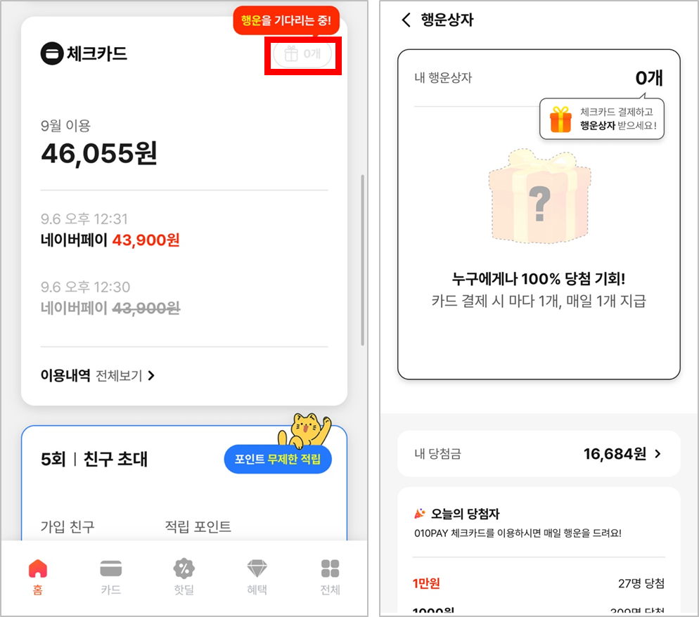 휴대폰에 010PAY 어플 다운 받으셔서 '결제행운상자'를 눌러 적립액을 확인하셔야 해요^^