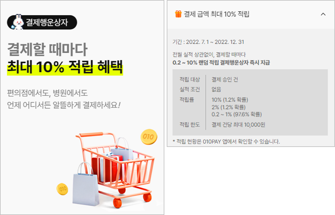 010PAY 체크카드는 전월 실적 상관없이 결제 할때마다 0.2~10% 랜덤 적립해줘요.