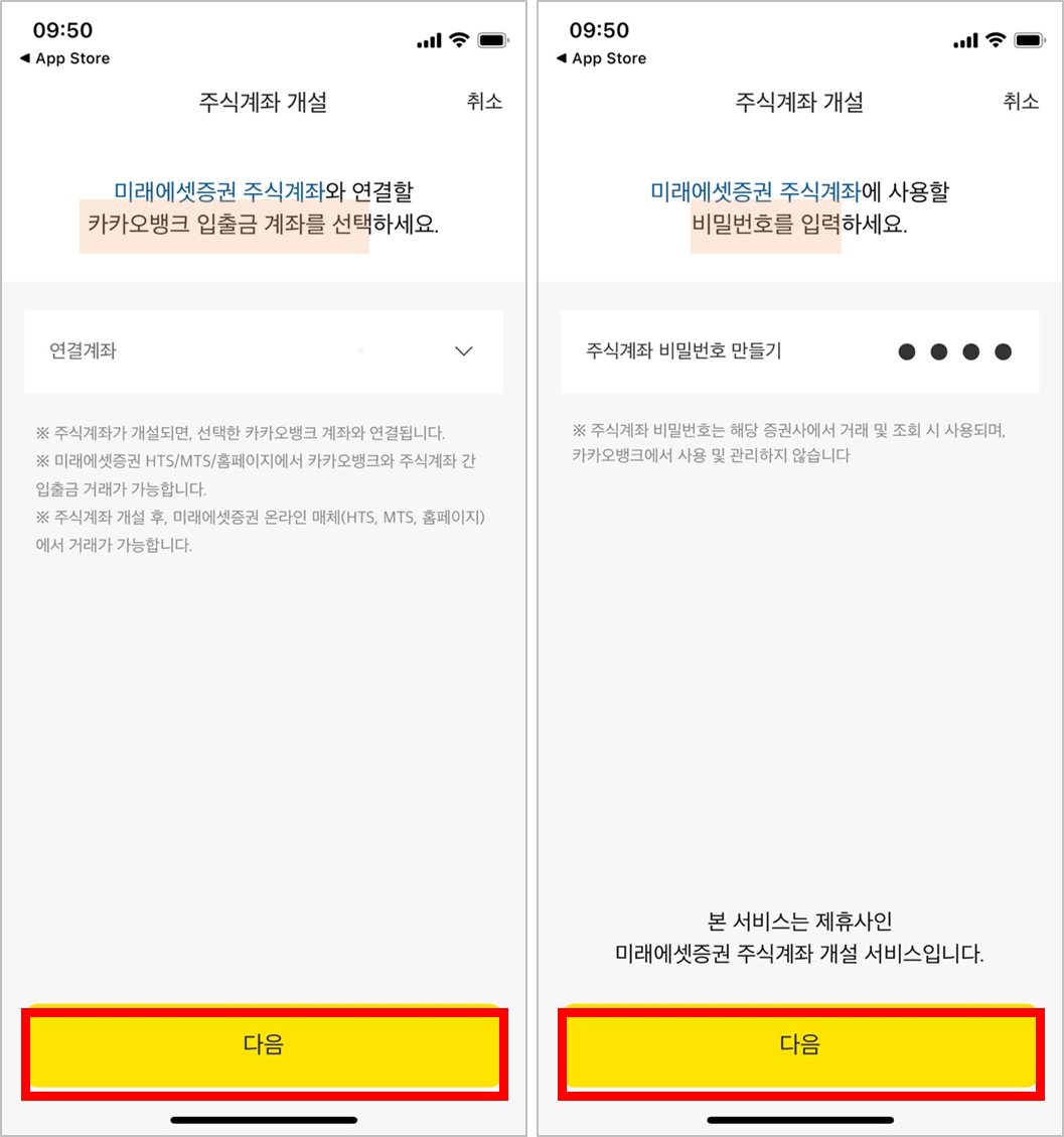 -미래에셋증권 주식 계좌와 연결할 카카오 계좌 선택하고 비밀번호 설정해주세요.