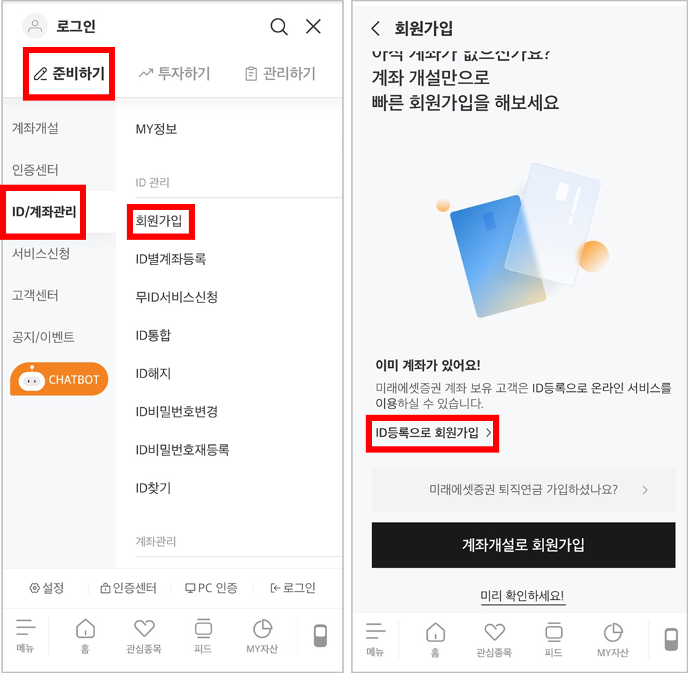 - 준비하기 → ID/계좌관리 → 회원가입 →ID등록으로 회원가입