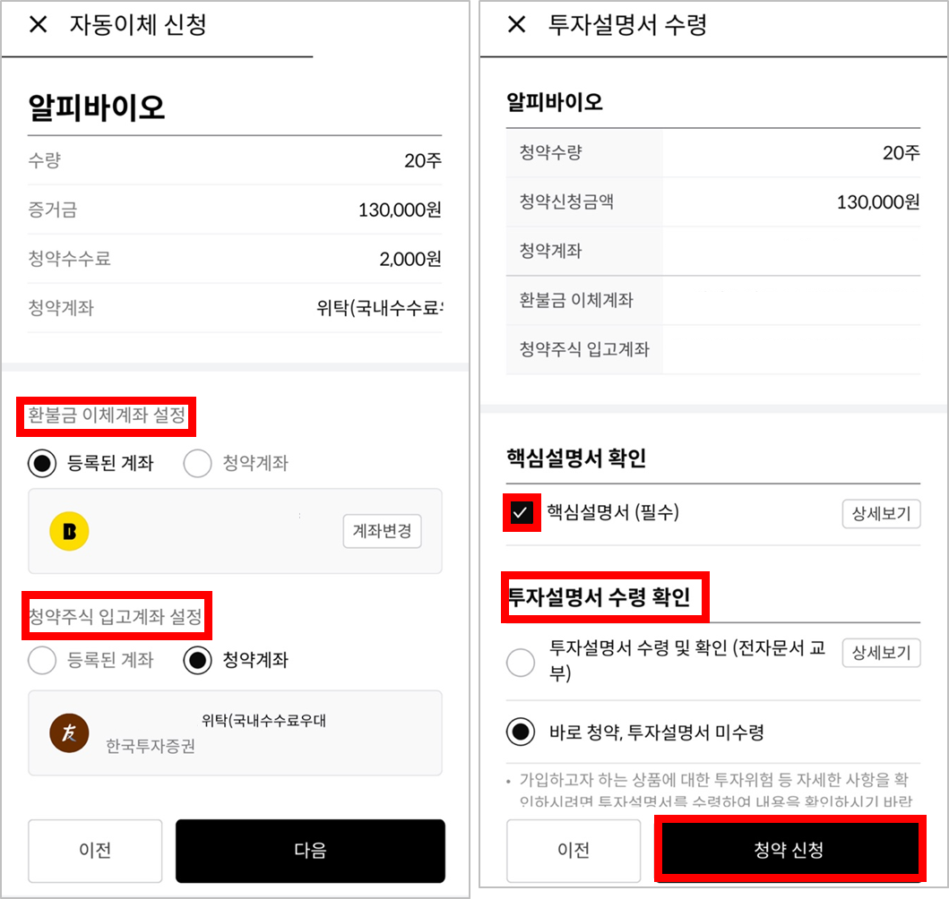 -환불금 이체계좌 및 청약주식 입고계좌 설정해주세요.