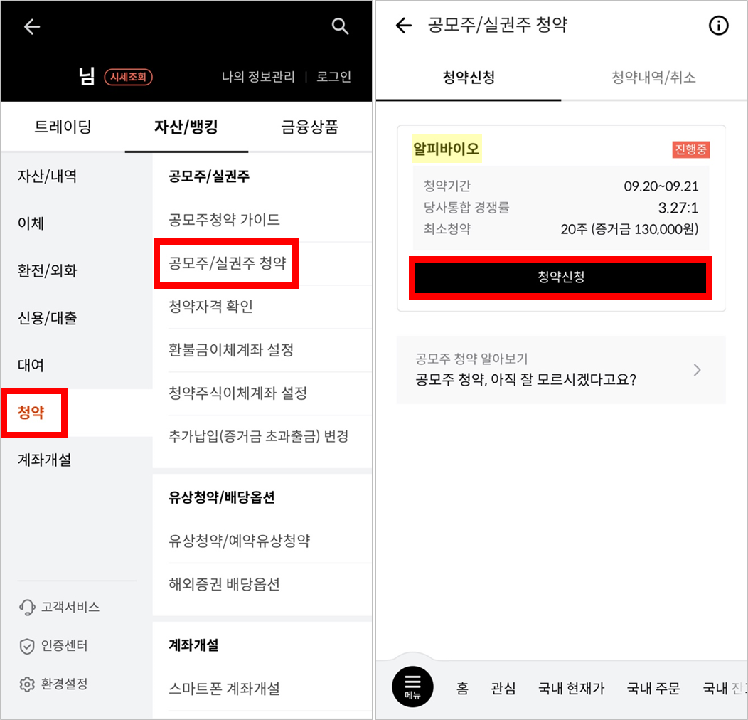 메뉴▶ 자산/뱅킹 ▶ 청약 ▶공모주/실권주 청약 ▶ 알피바이오