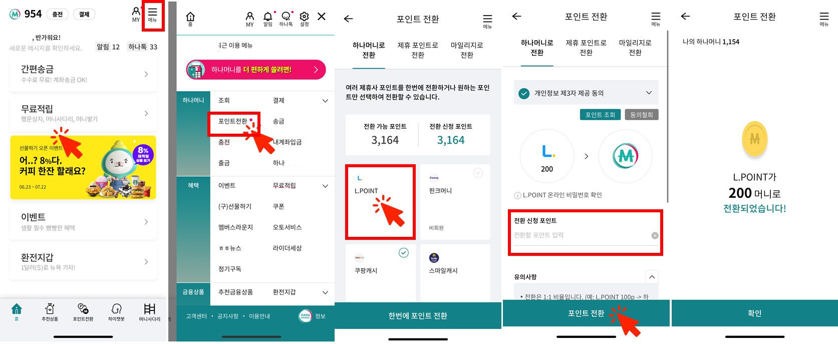 - 하나멤버스 앱으로 엘포인트 하나머니로 전환하기