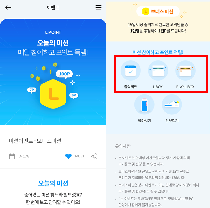 - 물마시기 이벤트는 하루 4번 4시간 간격으로 클릭해야하고 만보걷기도 힘들어